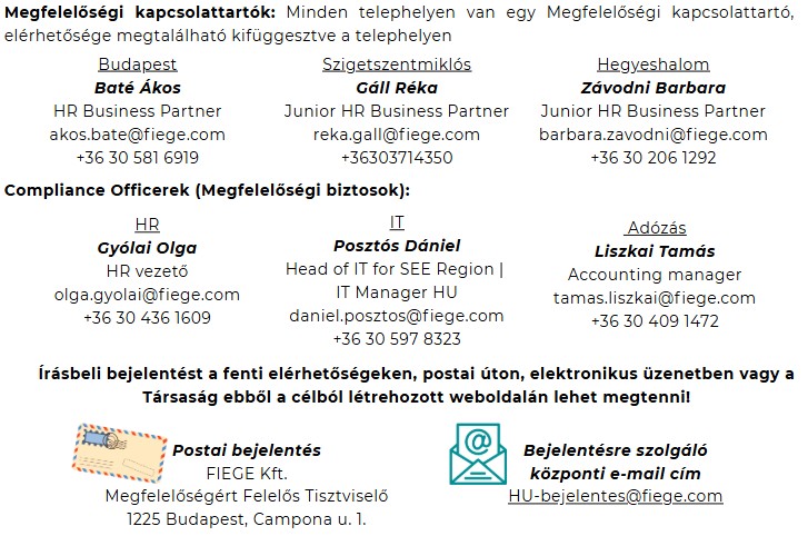 Amennyiben az Etikai Kódexben foglaltakkal kapcsolatos vagy más, etikai vagy jogi megfelelőséget érintő kérdés, észrevétel, panasz merül fel, azt bizalommal jelezheted a telephelyi kapcsolattartó, vagy a Megfelelésért Felelős Tisztviselő ismert elérhetőségein.